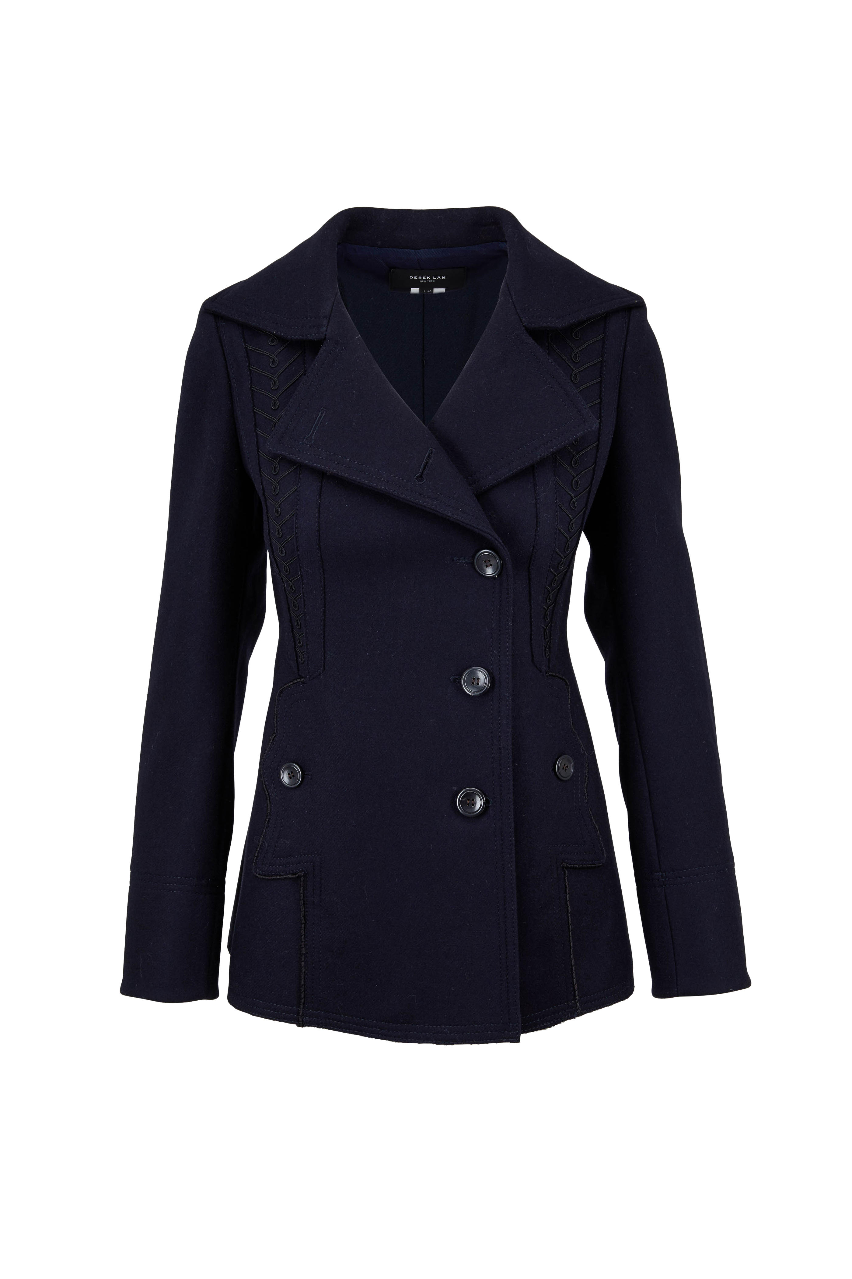 Hidden front button closure. We can always count on Derek Lam to deliver cozy outerwear which is why we caught up with the designer to find out his ultimate dress-for-fall tip. Derek Lam Wool Pea Coat with Navy Front Panel.