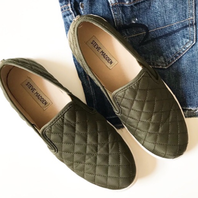 Olive green steve madden slip ons. Velvet or fabric upper material. Click or call 800-927-7671. Quilted Steve Madden slip on sneakers in olive green.